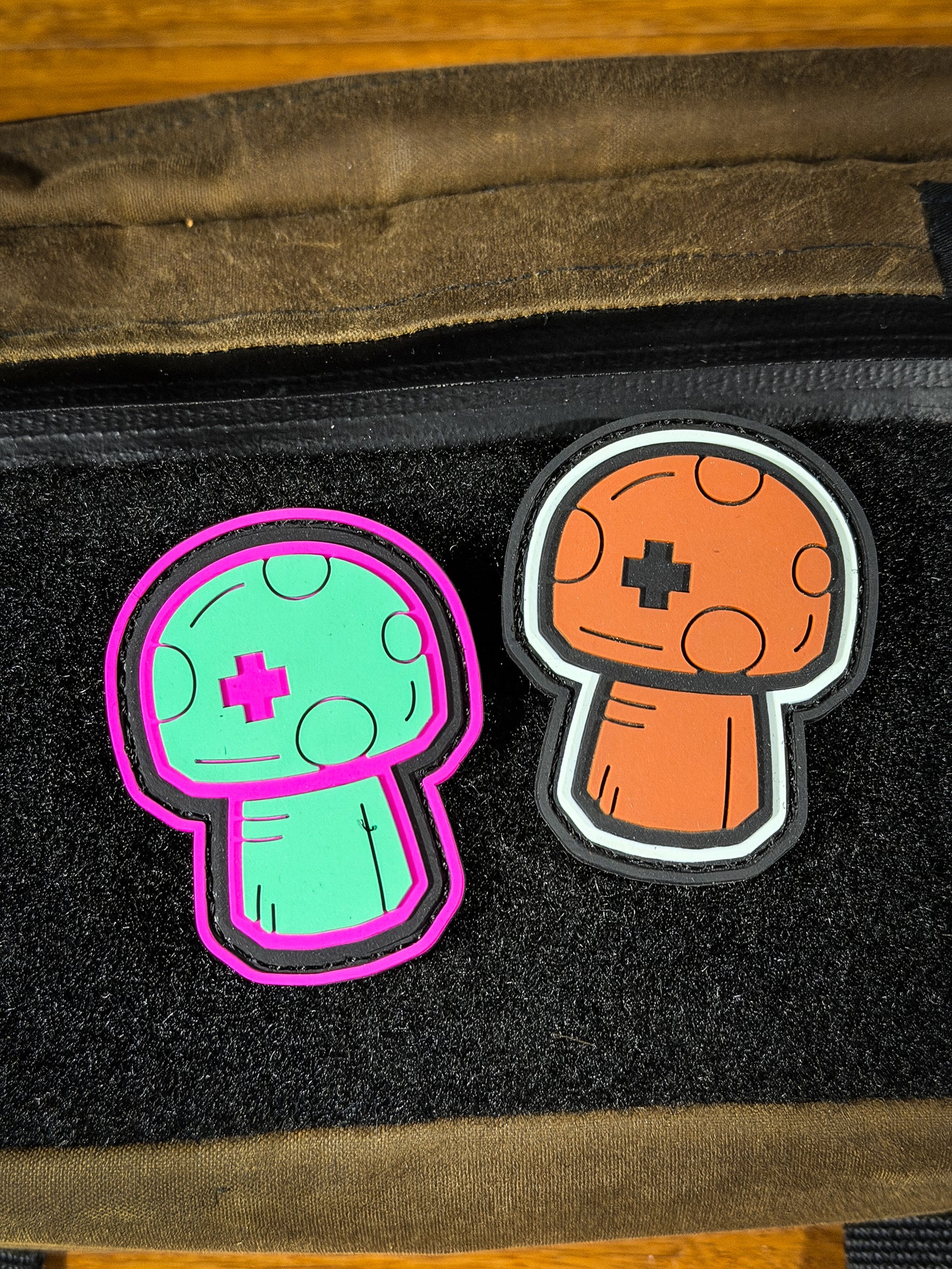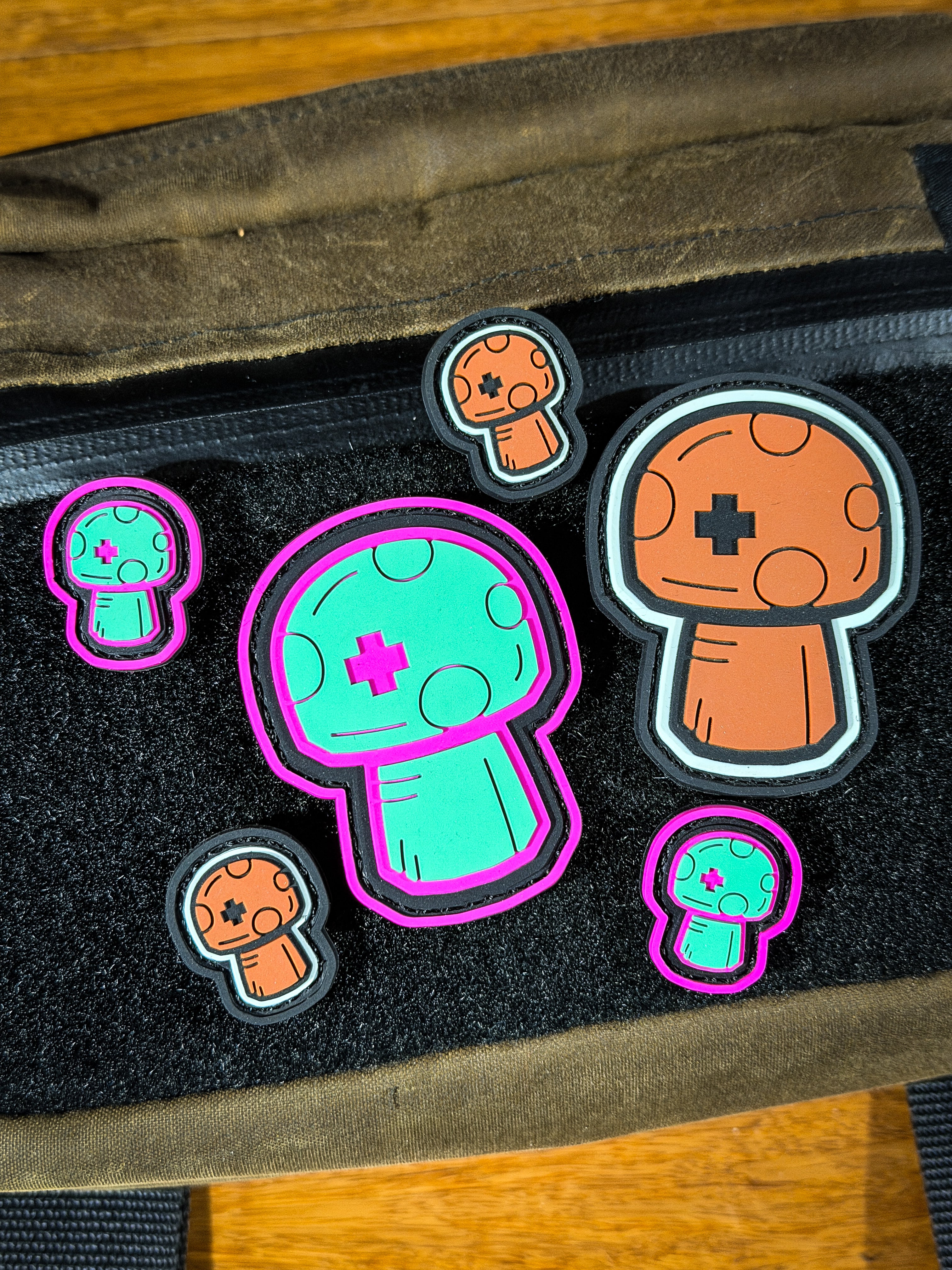 1" and 2" PVC mushroom Patches. Hot Pink & Teal and Gum & Black